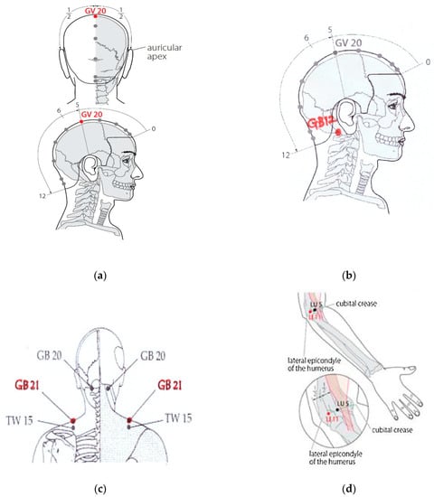 The six Meridian points (GV 20, GB 12, GB 21, LI 11, SI 3, KI 1) were selected to stimulate the body’s acupuncture points and Meridians, while at the same time uniting the energy and the blood through acupressure [,,]. This stabilization of the harmony of blood and energy through acupressure relaxes even the small muscles deep inside the body, and activates the function of the internal organs to keep the head cool and the organs warm [,].