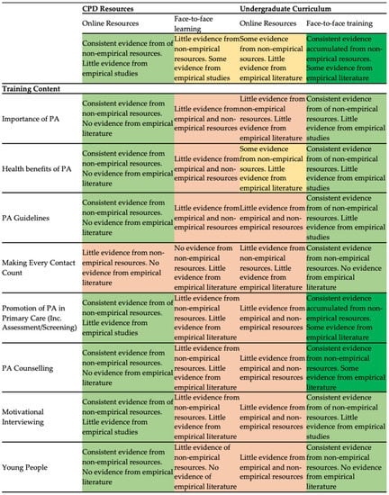 Colour-coded matrix based on quantity of evidence available of UK content and delivery strategies of PA promotion training to HCPs.