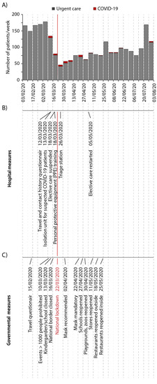 Patient numbers in the urgent dental care unit along with measures for infection control during the initial period of the COVID-19 pandemic. (A) Weekly patient numbers in the urgent dental care unit and patients with positive/suspected COVID-19 infections from 3 February to 31 July 2020. In temporal context, the middle and lower section show corresponding (B) hospital and (C) governmental measures taken as precautions against COVID-19. Each measure is given on the timeline (dotted line, each dot represents a day with weekly separation by vertical lines). The red line marks the beginning of the national lockdown.