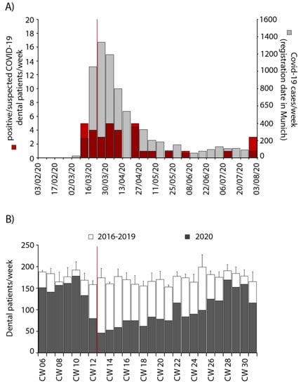Number of patients with positive/suspected COVID-19 infections concurrent with COVID-19 infections in Munich and comparison of patient numbers with previous years. (A) Patients with positive/suspected COVID-19 infections solely in the urgent dental care unit per week (left axis, red) in comparison with officially registered COVID-19 cases in Munich per week (right axis, grey) from 3 February to 31 July 2020. (B) Total patient numbers per week compared with patient numbers of the years 2016–2019 in the same calendar weeks (CW, mean ± standard deviation). The red line marks the beginning of the first national lockdown.
