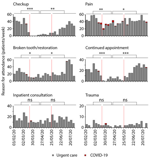 Reasons for seeking urgent dental care during the initial period of the COVID-19 pandemic. Patients´ reasons for attending the urgent dental care unit were categorized into checkup with minor questions (n = 507), pain (n = 1079), broken tooth/restauration (n = 588), continued appointment (n = 395), inpatient consultation (n = 381), and trauma (n = 64) from 3 February to 31 July 2020. The first red line marks the beginning and the second marks the end of the national lockdown, dividing the time into pre-lockdown, lockdown, and post-lockdown. The red bars represent patients with high-risk of or confirmed COVID-19 infection (ANOVA; * p ≤ 0.05, ** p ≤ 0.01, *** p ≤ 0.001).