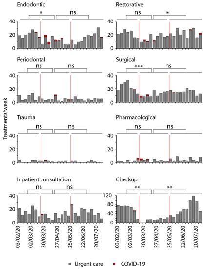Dental treatments carried out in the urgent dental care unit during the initial period of the COVID-19 pandemic. Treatments performed on patients per week in the urgent dental care unit from 3 February to 31 July 2020. Treatments were categorized into endodontic (n = 410), restorative (n = 525), periodontal (n = 137), surgical (n = 410), trauma (n = 32), and pharmacological (n = 77) interventions as well as inpatient consultations (n = 370) or checkups with minor questions (n = 1160). The first red line marks the beginning and the second marks the end of the national lockdown, dividing the time into pre-lockdown, lockdown, and post-lockdown. The red bars represent patients with high risk of or confirmed COVID-19 infection (ANOVA or Kruskal–Wallis; * p ≤ 0.05, ** p ≤ 0.01, *** p ≤ 0.001).