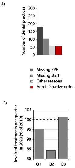 Effects of the COVID-19 pandemic on Bavarian dental practices. (A) Reason for temporary closure of dental practices in absolute numbers on 6 April 2020. (B) Invoiced treatments of patients insured under a statutory insurance in Bavaria in the quarters Q1–Q3 in 2020 in percent of the same quarters in 2019.