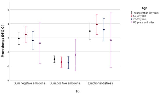 Except for persons older than 80 years, all age groups experienced a significant increase in the mean level of emotional distress from spring 2019 to March 2020 (Figure 2a). This was driven by increased anxiety in all age groups, accompanied by increased worrying and reduced happiness among persons in their 60s, 70s, and 80s (Figure 2b). Additionally, less irritation and engagement were found among persons in their 70s, while persons in their 60s experienced increased loneliness. Overall, we found no difference between the age groups in mean change of the single emotions, the sum of positive and/or negative emotions, and emotional distress when evaluated with linear regression (data not shown). The only exception was less change in irritation and engagement among persons in their 70s relative to persons under 60 years (irritation: ß: −0.70 (95% CI: −1.16, −0.25), p = 0.002, engagement ß: −0.53 (95% CI: −0.98, −0.08), p = 0.020).