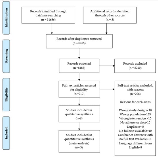 A total of 11,636 records were identified through the database searches (8485 unique records after deduplication). Of these, 209 were examined at full-text level. Three additional records identified through manual review (backward citation search) were also examined at full-text level. After the full-text evaluation of the 212 studies, we finally included six studies in the systematic review and five of them in the meta-analysis (Pagoto et al., 2013 [] was not included in this analysis due to missing the number of completers data) (Figure 1).