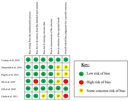Risk of bias of the included studies was assessed using the revised Cochrane Risk of Bias tool []. Items were scored as follows: low risk of bias, high risk of bias, or some concerns. Two independent reviewers extracted data and assessed the risk of bias. Disagreements were solved by a consensus or, when needed, by involving a third reviewer.
