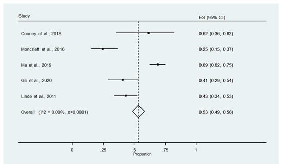 Five studies provided sufficient data to determine the percentage of participants who complete the intervention (Table 2) [,,,,]. The meta-analysis of proportions (Figure 3) showed that 53% (95% CI 49% to 58%) of the participants assigned to the intervention group completed the whole intervention.