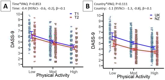 Associations between PA and DASS-9 are presented in Table 3 and Figure 1A,B. All aims were tested using the fully adjusted Model 4. Aim 2: there was a significant association between PA and DASS-9 (p < 0.001). As shown in Table 3 (Model 4), the DASS-9 score is 1.1 units lower (beneficial) for moderate vs. low PA exposure (p < 0.001) and 1.7 units lower for high vs. low PA exposure (p < 0.001). Aim 3: the Time by PA interaction was not significant (Figure 1A, p > 0.05), though the Time effect was with DASS-9 significantly lower at T2 compared to T1 by 0.4 units (p < 0.001). Aim 4: the country by time by PA interaction was not significant (Figure 1B, p > 0.05), though a country main effect was observed with NZ DASS-9 scores being significantly lower compared to the UK by 1.1 units (p < 0.001).