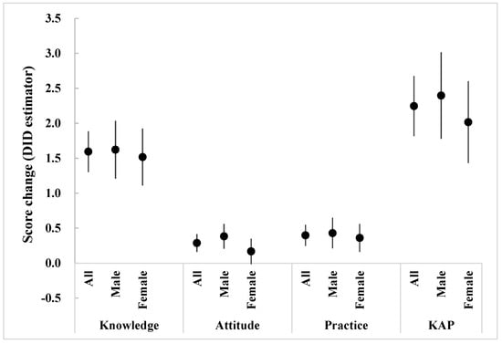 Sex-specific KAP score changes after intervention for students in the intervention school compared with the control school (adjusted with age by difference−in−difference (DID) analysis; KAP represents the total score of knowledge, attitude, and practice; score changes mean DID estimators).