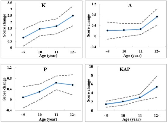 Age-specific KAP score changes after intervention for students in the intervention school compared with the control school (adjusted with sex by difference−in−difference (DID) analysis; the dotted lines represent the upper and lower limit of the 95% Confidence Interval of the score change; KAP represents the total score of knowledge, attitude, and practice; K: knowledge; A: attitude; P: practice; score changes mean DID estimators).