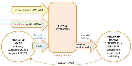 In the field of hospitality and tourism, numerous authors have identified the relationship between the destination image and visitors’ satisfaction and loyalty []. However, whether any experience in particular contributes to the well-being of tourists has not been shown. Instead, several authors demonstrated these relationships in the context of the consumption of quality goods and services [,]. For that reason, the new conceptual model (Figure 1) is based on Marine-Roig’s hermeneutic circle of destination image formation [] and Grönroos’s service quality model []. In short, the proposed model addresses quality experiences in the context of hospitality and tourism, and this study uses it to analyze consumers’ subjective well-being resulting from dining experiences in luxury restaurants.