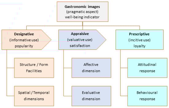 Thus, the deep semiotic constituent of the perceived image underpins its analysis through semiotic conceptual models fully contrasted in other scientific fields []. Figure 3 shows an adaptation of the philosopher and semiotician Charles William Morris’s trichotomies [,] to the semantic—designative, appraisive, and prescriptive—and pragmatic—informative, valuative, and incitive—aspects of the gastronomic images []. As Figure 3 shows, the three semantic aspects are distinctly different but hierarchically interrelated [].
