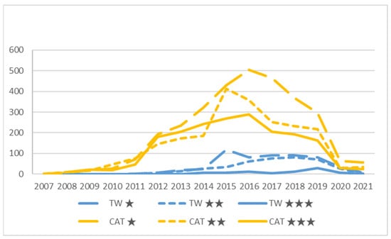 Figure 4 shows the distribution of TripAdvisor OTRs written in English by region and year. Both regions show a sharp drop in OTRs starting in 2020, which is understandable due to the SARS-CoV-2 pandemic lock down. The curves for Taiwan indicate a slight decline from 2018, despite the fact that the influx of foreign tourism from English-speaking countries continued to grow at that time []. The curves for Catalonia indicate a decrease in the number of OTRs from 2016; in contrast, English-speaking tourists continued to grow in those years [], with a slight setback in 2017 due to the serious events that took place (terrorist attack and independence movement) [,]. These trends indicate a decline in restaurant popularity as measured by the number of OTRs.