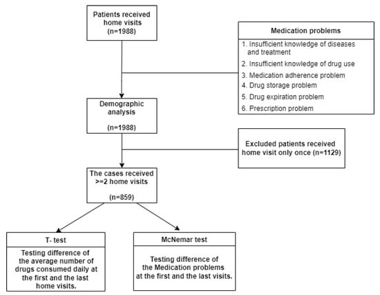 A chi-square test was used to analyze the participants’ medication problems. For patients who received multiple home visits, the McNemar test was used to compare the results of the first and final visits and thereby evaluate the effectiveness of the visits, and the t-test was used to compare the number of drugs taken each day between the first and last visits. The collated data are presented in a 2 × 2 table.