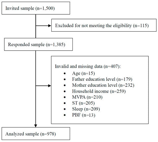 We contacted 1500 participants and received a 92.3% response rate. After cleaning invalid and abnormal values of all independent and dependent variables (Figure 1), in total, 978 eligible participants (53.2% boys; 9.11 ± 1.39 years) were included in the final analysis.