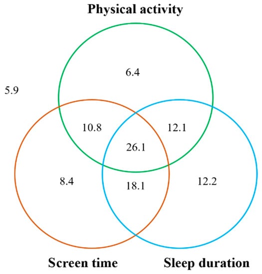 The numbers within each circle are added to the proportion of children meeting each individual guideline (i.e., 55.4% for physical activity, 63.4% for screen time and 68.4% for sleep duration). The total non-overlap area of each circle represents the proportion of children meeting one of the three guidelines (i.e., 6.4% + 8.4% + 12.2% = 27.0%). The total overlap areas of two circles represents the proportion of children meeting two guidelines of the three guidelines (i.e., 10.8% + 18.1% + 12.1% = 41.0%). The overlap area of three circles represents the proportion of children meeting all three guidelines (i.e., 26.1%). The outside area of the circle represents the proportion of children not meeting any of the guidelines (i.e., 5.9%).