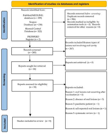 The remaining 285 title-abstracts were screened, and 267 were excluded; of the 18 abstracts relevant to and compliant with the eligibility criteria, full-texts were assessed. Additionally, 10 articles were excluded, specifically because 4 studies described oral manifestations not following anti-SARS-CoV-2 vaccination; 3 did not report lesions of the oral mucosa; 1 involved a <18 years old subject; 1 reported oral lesions not diagnosed by clinical examination but through questionnaires administration; and 1 was a systematic review of the literature.