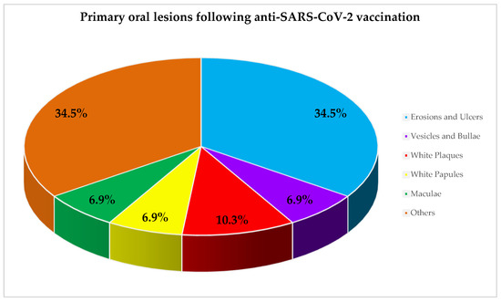 Data extracted and analyzed in the present systematic review show an overall low prevalence of oral lesions following anti-SARS-CoV-2 vaccination, appearing to be higher in females (68.8%) compared to males (31.2%) and showing a slight predilection for subjects <60 years old. Erosions and ulcers (34.5%), undefined oral lesions (10.35%), hemorrhagic crusts (10.35%), white plaques (10.3%), swelling (6.9%), white papules (6.9%), maculae (6.9%), epithelial desquamation (6.9%), and vesicles and bullae (6.9%) were found following the Pfizer-BioNTech vaccine in 9 cases, the Moderna vaccine in 2 cases, and the AstraZeneca, Serum Institute of India, Sinopharm Beijing, and Johnson&Johnson in 1 case, respectively; in the remaining case, vaccine type was not specified. In 8 cases, the oral lesions occurred following the administration of the first dose and in 7 after the second dose; in 1 case, data were missing.