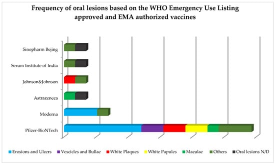 Frequency of oral lesions based on the WHO Emergency Use Listing approved and EMA authorized vaccines is shown in Figure 3.