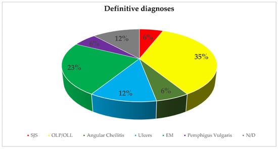 Diagnostic procedures performed were reported in 12 studies [,,,,,,,,,,,] and comprised: (n = 8) serological tests, altogether for herpes simplex type 1 and 2, Epstein Barr, human immunodeficiency, hepatitis B and C viruses, cytomegalovirus, mycoplasma pneumoniae, chlamydia pneumoniae, and treponema pallidum; (n = 1) Nucleic Acid Amplification Test (NAAT); (n = 2) real-time reverse transcription-polymerase chain reaction (RT-PCR); (n = 1) nasopharyngeal swab; 8 biopsies; 1 case of removal of amalgam restorations; (n = 1) direct immunofluorescence test; (n = 1) skin allergy test; and (n = 2) maneuvers for evaluation of Nikolsky’s sign. Histological examination was performed in only fourstudies [,,,].