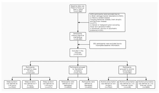 After fitting baseline data with 2018 tracking data, 17,596 participants in the cohort were eligible for inclusion. Since the primary outcome for this study was cognitive function, 1231 participants who did not meet the criteria were excluded due to: (1) brain damage/mental retardation (n = 523); (2) memory impairment, such as Alzheimer’s disease, brain atrophy, and Parkinson’s disease (n = 277); (3) cancer or malignancy other than minor skin cancer (n = 180); and (4) emotional, nervous system, or psychiatric problems (n = 251). After excluding participants for the criteria detailed above, participants with incomplete baseline information were excluded (n = 951), and data were available for 15,414 participants. The complete participants’ selection and classification process are shown in Figure 1. The participants were divided into 8 groups according to sleep duration (≤6 h, 7–8 h, and ≥9 h per night), depressive symptoms (nondepressed and depressed), and alcohol consumption (non-drinkers, more than 1 drink per month, and less than 1 drink per month), respectively, for the analyses. The complete participants’ selection and classification process are shown in Figure 1.