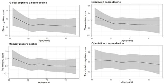 Figure 3 shows the process of cognitive decline with age. As illustrated in Figure 3, all four cognition z scores showed a marked downward trend with increasing age, after adjusting for covariates. The curves of cognition showed a downward trend from age 50 to 55 years, while the curves shifted to an upward trend, when the sampling area reached an inflection point, and then cognition decline persisted.