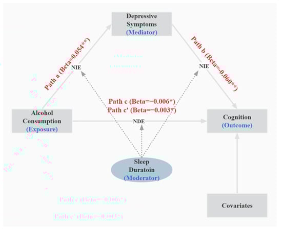 There has been much discussion and controversy about the association between moderate alcohol consumption and cognition. A survey of a prospective cohort study in the USA indicated that light–moderate (less than 8 drinks per week for women and less than 15 drinks per week for men) alcohol intake was positively related to better cognitive performance in the middle-aged and older []. However, the latest research from Oxford University suggested that any alcohol exposure was harmful to the brain, and deteriorating brain conditions have been linked to increased alcohol consumption []. Both sleep duration and depression have been reported to be positively related to cognition decline [,,,], which was similar to this present study. Although all these factors are considered to be risk factors for cognition, this is the first study to identify the mechanism of depressive symptoms mediating the relationship between alcohol consumption and cognition when sleep plays a moderating role. There was an apparent interaction between cognition and alcohol consumption, depression, and sleep duration (p < 0.05). Meanwhile, previous studies suggested that cognition may be mediated by depressive symptoms and/or sleep duration. An epidemiological study of 246 nondemented elderly adults in Shenzhen, Guangdong Province, China, reported that depressive symptoms may mediate the association between sleep disorder and cognition decline []. Furthermore, another cross-sectional study investigated 204 MCI elderly adults living in the community, indicating that about 26% of the cognitive impact of depressive symptoms was mediated by sleep quality [].