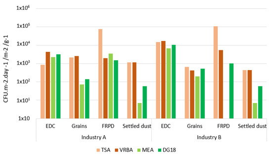 In what concerns industry A, total bacteria contamination (measured by TSA) presented the highest values in FRPD (7.45 × 104 CFU·m−2), followed by grains (2.20 × 104 CFU·g−1), EDC (2.20 × 104 CFU·m−2·day−1) and settled dust (1.17 × 103 CFU·g−1). In VRBA media, EDC evidenced the highest Gram-negative counts among the matrices (4.5 × 105 CFU·m−2·day−1). Grains and FRPD had similar values of Gram-negative bacteria (2.52 × 103 CFU·g−1 and 2.00 × 103 CFU·m−2, respectively), while a lower value was obtained from settled dust samples (1.17 × 103 CFU·g−1).