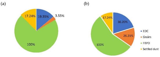 Aspergillus sp. distribution in DG18 culture medium in samples from: (a) industry A and (b) industry B. (EDC: log [CFU·m−2·day−1]; Grains, settled dust: log [CFU·g−1]; FRPD: log [CFU·m−2]).