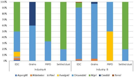 Aspergillus sections distribution in DG18 in both industries (EDC: log [CFU·m−2 day−1]; Grains, settled dust: log [CFU·g−1]; FRPD: log [CFU·m−2]).