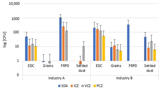 Regarding samples from industry B, the highest fungal contamination numbers were observed on EDC samples on both MEA and DG18 (6.73 × 103 CFU·m−2·day−1; DG18: 1.06 × 104 CFU·m−2·day−1 respectively), followed by grains (MEA: 2.01 × 10 CFU·g−1; DG18: 5.34 × 102 CFU·g−1) and settled dust (MEA: 7 CFU·g−1; DG18: 5.80 × 101 CFU·g−1). In contrast, no fungal counts were obtained in FRPD samples on MEA, only being identified on DG18 (DG18: 5.80 × 101 CFU·m−2) (Figure 2).