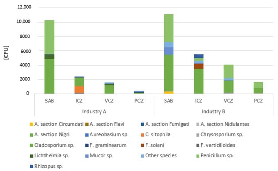 FRPD from industry A have evidenced the highest fungal counts (MEA: 3.50 × 103 CFU·m−2; DG18: 1.50 × 103 CFU·m−2) among all the collected samples, which was followed by EDC (MEA: 2.29 × 103 CFU·m−2·day−1 DG18: 3.15 × 103 CFU·m−2·day−1). The lowest counts were obtained on grains (MEA: 7.35 × 101 CFU·g−1; DG18: 1.41 × 102 CFUcfu·g−1) and settled dust samples (MEA: 7 CFU·g−1; DG18: 5.80 × 101 CFU·g−1).