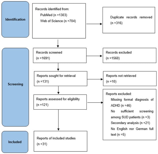 The following inclusion criteria were used (1) a publication of the research paper in a peer-reviewed journal, (2) the formal diagnosis of SUD according to DSM [] or ICD [], (3) the formal diagnosis of ADHD in adults or adolescents according to DSM [] or ICD [] (diagnosis based only on a self-report questionnaire is not sufficient), and (4) whether systematic and sufficient screening among SUD populations had been performed. The following exclusion criteria were used (1) publications only using secondary analysis of data (e.g., systematic reviews), (2) the paper not being eligible in English or German language, and (3) a lack of information necessary for the meta-analysis.