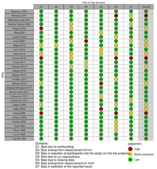 We screened 1691 records and included 31 studies with a total participant size of 12,524. Three studies with opioids (n = 2357), seven studies with cocaine (n = 2974), and seven studies with alcohol (n = 2143) as the main substance of abuse were included. For a list of included studies, see Table 1. The risk of bias of the included studies was estimated as overall low see Figure 2 and Figure 3.