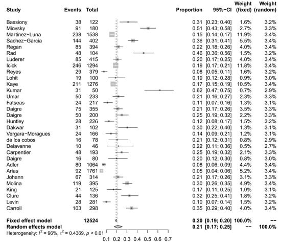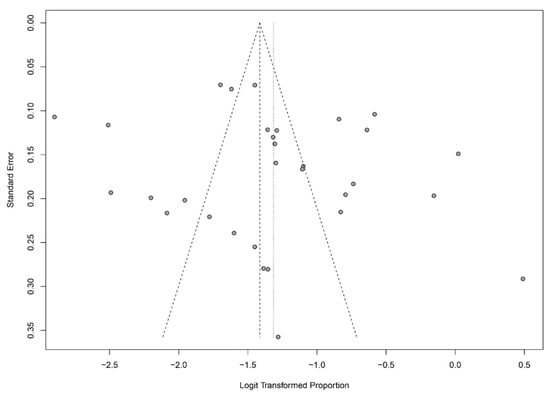 With a random-effects model, we determined the general ADHD prevalence among SUD patients of 21% (95% CI = [0.1741; 0.2548]). Significant heterogeneity was present (I2 = 95.8%, Q = 721.09; df = 30; p < 0.0001). A moderator analysis was conducted for age, suggesting that age has only a slight influence on heterogeneity, Q (df = 25) = 20.2909, p = 0.7314. For the Forest plot of the effect sizes and 95% confidence intervals, see Figure 4. The visual inspection of the funnel plots and the egger intercept (z = −1.69, p = 0.30) suggest the absence of a publication bias (see Figure 5).