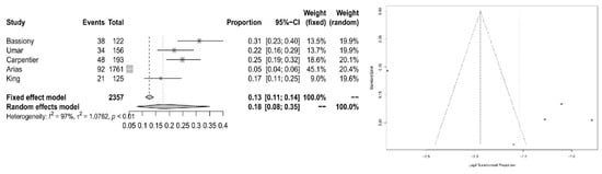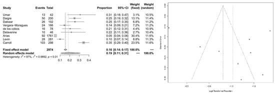 For the subpopulation of cocaine users, we calculated an ADHD prevalence of 19% (95% CI = [0.1058; 0.3102]) with significant heterogeneity (I2= 96.7%, Q = 238.89; df = 8; p < 0.0001). For Forest and Funnel plots, see Figure 6.