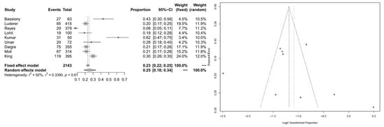 For the subpopulation of alcoholics, we calculated ADHD prevalence of 25% (95% CI = [0.1845; 0.3360]) with significant heterogeneity (I2 = 92.5%, Q = 106.55; df = 8; p < 0.0001). For Forest and Funnel plots, see Figure 8.