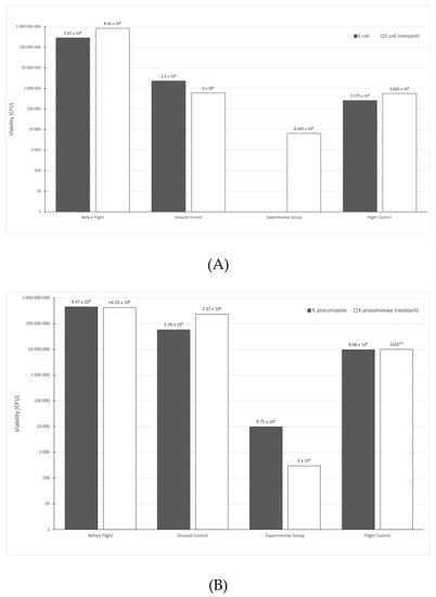 Referring to the main objective of this study, the viability of bacterial strains before and after exposure to the stratospheric environment was assessed and compared. The results showed some tendency in the pattern of viability between bacterial strains. Both sets (the experimental group and flight control group) that were sent into the stratosphere had noticeably lower absolute CFU values compared to before the flight and ground control group; however, the viability of bacteria covered with aluminum foil (the flight control group) had better survival than bacteria without protection (Figure 3). Compared to the ground control group, the rate of survival of the flight control samples was 1.06–24.3 times lower (E. coli—8.93; E. coli (resistant)—1.06; K. pneumoniae—5.93; K. pneumoniae (resistant)—23.7; P. aeruginosa—5.16; P. aeruginosa (resistant)—3.64; E. faecalis—15.9; E. faecalis (resistant)—11.7; S. aureus—24.3; S. aureus (MRSA/VSSA)—23.7; S. aureus (MRSA/VISA)—6.21). In the experimental group, the susceptible variant of E. coli and both strains (susceptible and resistant) of P. aeruginosa did not survive the flight. In the same group, the survivability of other strains ranged from 92.95 to 1.23 × 106 times lower than in the ground control group (E. coli (resistant)—92.95; K. pneumoniae—5.19 × 104; K. pneumoniae (resistant)—7.9 × 105; E. faecalis—1.63 × 105; E. faecalis (resistant)—1.4 × 105; S. aureus—1.1 × 105; S. aureus (MRSA/VSSA)—1.1 × 104; S. aureus (MRSA/VISA)—1.23 × 106). Although most of the samples contained live bacteria after the flight, it is important to be aware that this was only a small fraction of the total. Table 2 shows the percentages (relative to initial inoculum) of alive bacteria after the flight.