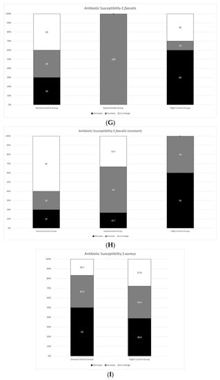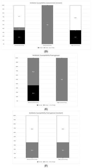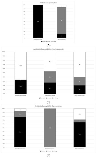 Relationship between changes in antibiotic susceptibility in each group. Antibiotic susceptibility of E. coli (A); Antibiotic susceptibility of resistant E. coli (B); Antibiotic susceptibility of K. pneumoniae (C); Antibiotic susceptibility of resistant K. pneumoanie (D); Antibiotic susceptibility of P. aeruginosa (E); Antibiotic susceptibility of resistant P. aeruginosa (F); Antibiotic susceptibility of E. faecalis (G); Antibiotic susceptibility of resistant E. faecalis (H); Antibiotic susceptibility of S. aureus (I);Antibiotic susceptibility of S. aureus (MRSA/VSSA) (J); Antibiotic susceptibility of S. aureus (MRSA/VISA) (K). Ground Control—samples kept on the ground; Experimental Group—samples flown to the stratosphere (without protection); Flight Control—samples flown to the stratosphere (with a protective layer of aluminum foil); Decrease—narrowing of the halo around diffusion discs/increase in MIC; Increase—widening of the halo around diffusion discs/decrease in MIC; No change—no change in the halo around diffusion discs/MIC. Experimental group is not indicated in cases where no growth was obtained. For absolute values of halos around diffusion discs see Supplementary Material Table S4.