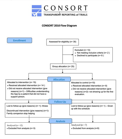 Participants were assigned to an experimental group (EG) or control group (CG) according to the willingness of the participant’s relatives or caregivers to implement the intervention program at home. All the participants of the experimental group and their caregivers attended a face-to-face meeting where the operation of the application and the electronic devices were explained to them. This session was also used to check that all patients had sufficient perceptual skills (visual, auditory, and proprioceptive) to interact correctly with the devices and that they understood the instructions of some of the exercises designed. Otherwise, they would be suggested to join the control group. For example, patients had to touch the devices based on the color of the light and/or sound, and also passively detect the vibration of the device. One patient was excluded from the study due to difficulties in using the mobile application. In this case, the patient did not have a support person (family member or caregiver) to carry out the intervention. The other patients were able to interact satisfactorily with the electrical devices.
