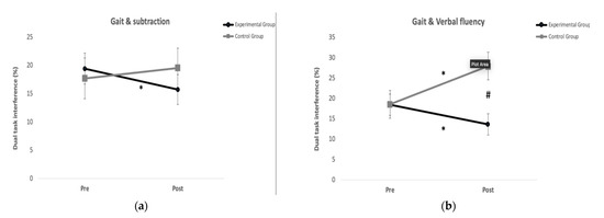Results from the dual-task tests: (a) Experimental group reduced significantly the dual task interference for the Gait and subtraction test after the training program; (b) Experimental group reduced significantly the dual task interference for the Gait and subtraction test after the training program, while the control group increased it significantly. After the program training, the experimental group was significantly better than the control group in the Gait and Verbal fluency test. * Differences with pre (p < 0.05). # Differences with experimental group (p < 0.05).
