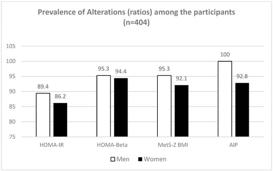 Table 3 and Figure 1 and Figure 2 show the proportion of participants presenting alterations in single parameters and biochemical indexes. Lower prevalence was observed for HbA1c, with 34.1% of men and 31.3% of women showing elevated values (above of the cutoff point of 5.7%) for that parameter []. On the other hand, the prevalence was higher for the AIP index, with 100% of men and 92.8% of women presenting values above the moderate risk cutoff point of 0.1–0.24 and >0.24 at high risk of cardiovascular disease [].