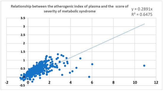 It can be noted in Figure 3 that the severity score of metabolic syndrome (MetSs) and the atherogenic index of plasma (AIP) presented a significant correlation, with a coefficient of determination (R2) of 69%, indicating that the two indexes are strongly related.