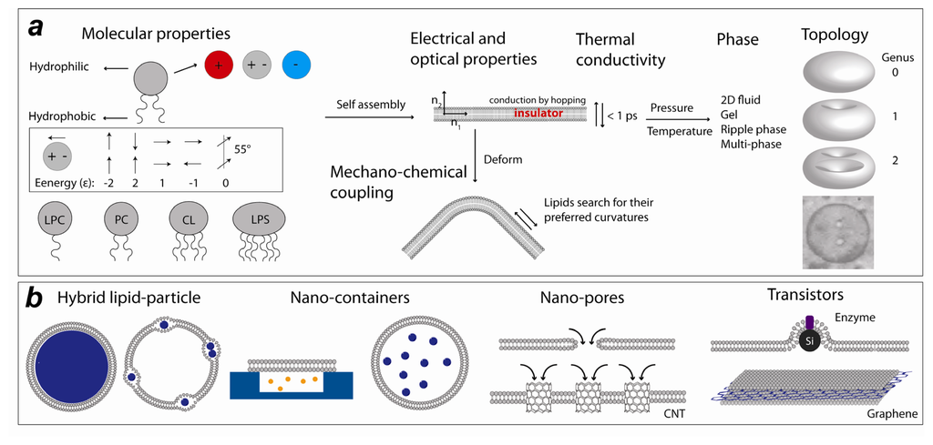 (a) Physico-chemical properties of phospholipids. Phospholipids are composed of a hydrophilic head group and hydrophobic tails (N = 1–6). PC: phosphatidylcholine, LPC: LysoPC, CL: cardiolipin, LPS: lipopolysaccharide. The head group may carry a positive or negative charge. It may also be neutral but possess a significant electric dipole which enforces particular arrangements in the monolayer and bilayer assemblies. Self assembly of phospholipids results in bilayers or monolayers. Bilayers are birefringent [], thermally conductive (energy transfer on sub-picosecond time scales; κ~several Watt/mK []), behave as insulators perpendicular to the membrane and in the core part whereas they are electrically conductive within the plane of the membrane due to proton hopping in the interfacial water []. Assembled bilayers display different phases depending on the temperature (T) and pressure (P) of the environment. The fluid bilayer is also deformable and introducing curvature may lead to spatial redistribution of lipids, some preferring certain curved regions. Lipid bilayer can form topologically rich structures: a spherical bilayer (genus 0) vesicle, a genus 1 and a genus 2 vesicle [,] are shown. In addition to phospholipids, also other lipids such as sterols have been used in nanotechnological applications; (b) Lipid based nano-devices. Two examples of hybrid lipid particles are presented: in one case the particles are enclosed by the vesicle and in the other case the particles are embedded in between the leaflets. Nano-containers can be formed when a hard nano well is sealed by a lipid bilayer. Membrane pores can be generated within a bilayer by applying voltages or with the help of carbon nanotubes functionalized with hydrophilic groups at their ends. A composite structure made of silicon nano-wire and enzyme functionalized lipid bilayer is shown. Another example of lipid based nanostructures with applications in electronics is lipid bilayer-graphene hybrid where graphene is embedded in between the leaflets of a bilayer and thereby the graphene’s physical properties are modulated; (c) Liposomes functionalized with nanoparticles allowing for radiation/magnetic field triggered cargo release [–]. The ticks on the box sides indicate the size or the size range of the synthesized particles.