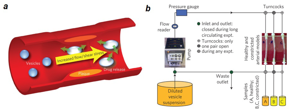 Shear-stress sensitive nano-sized lipid vesicles for targeted drug delivery. (a) Schematic of the design, in which changes in endogenous shear stress trigger drug release from the vesicles. (b) Experimental set-up. An extracorporeal heart pump is connected to a plastic mimic of normal or constricted arteries and the loaded vesicles are allowed to circulate in the artificial cardio-vascular system for 20 min. (c,d) Fluorescence release patterns of PC vesicles with 0–1 mol% Brij S10 at 37 8 °C. Release in the normal arterial model (c) and in the constricted artery model (d). Brij S10 concentration is plotted versus number of passes through the vascular system, with fluorescence release along the z-axis. After subtraction of background fluorescence release, the fluorescence signal represents the fractional additional release as result of circulation in the arterial model. Figure is adapted from [] with permission.