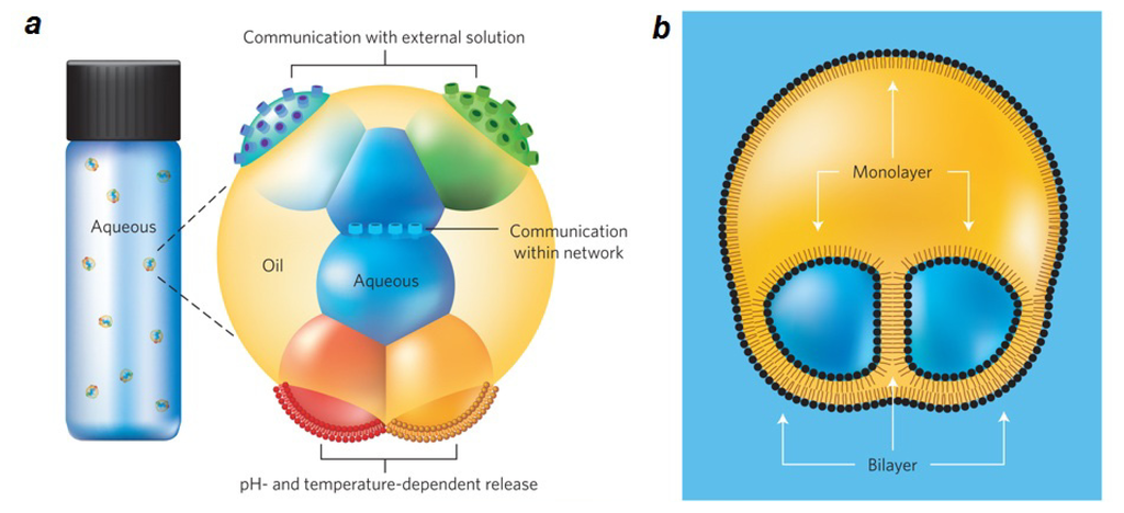 An important subfield of microfluidics is micro and nanodroplet engineering [–], in which the properties of lipid molecules have also been employed. Aqueous droplets in oil stabilized by a monolayer of lipids and joined through interface bilayers can be made. These droplets allow for engineering networks of droplets both in water and oil phases. Such a design is applicable to tissue mimics in medical applications and synthetic biology, but can also be applied to fabricate light sensors and batteries by incorporating pumps, channels and pores into the bilayers. Furthermore functional bilayer interface was formed in nanoliter size multisomes.—networks of aqueous droplets that are encapsulated within small drops of oil in water—that can be useful for drug delivery [] (Figure 3). Droplet interface bilayers formed by contacting lipid monolayer-coated aqueous droplets against each other in oil–lipid media, can be permeabilized in a number of ways, allowing for triggered release of materials. One strategy is incorporation of photo-polymerizable phospholipids that crosslink upon UV irradiation. Crosslinking in turn results in pore formation across the bilayer and material transport [].