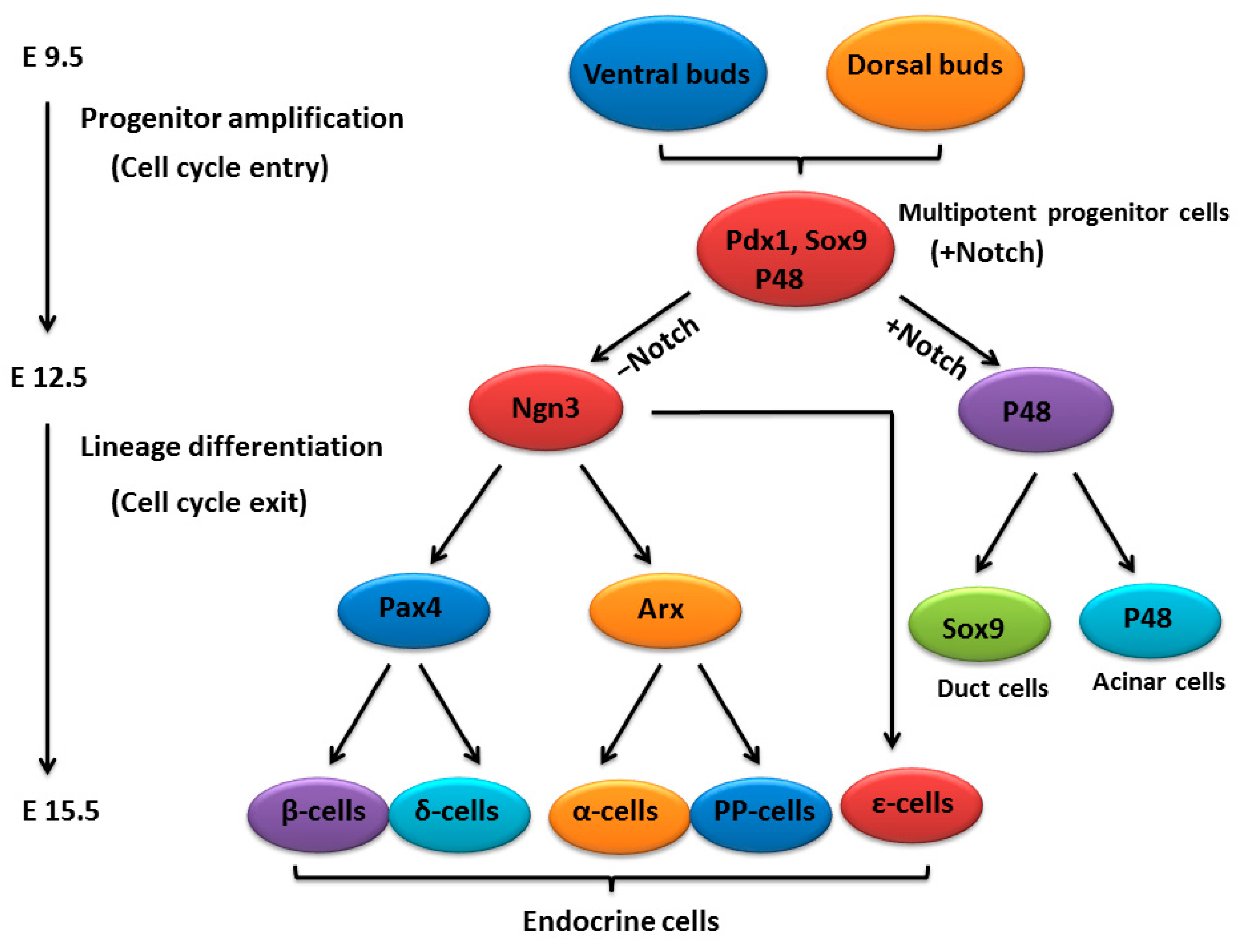 Lineage-specific transcription factors control the differentiation of pancreatic progenitor cells towards a specific type [40,41]. Pancreatic cells arise from pancreatic duodenal homeobox 1 (Pdx1)-expressing progenitors (Figure 1). As pancreatic development proceeds, the Pdx1 gene becomes progressively confined to endocrine β-cells, where it plays an essential role in the transcriptional activation of the insulin gene [42]. The progenitors co-express sex-determining region Y (Sry) box 9 (Sox9) and pancreas specific transcription factor1a (Ptf1a, also known as P48) [43,44] (Figure 1). However, Sox9 expression is eventually limited to a subset of ductal and centroacinar cells (CACs) in adults, and Ptf1a is expressed solely in mature acinar cells [45,46] (Figure 1). The Basic Helix-Loop-Helix (bHLH) transcription factor Ngn3 drives MPCs towards the endocrine cell fate [47]. The specification of the endocrine subtypes is essentially under the control of the opposing actions of aristaless related homeobox (Arx) and paired box 4 (Pax4) acting downstream of Ngn3 [48] (Figure 1). Ngn3-null mice fail to generate pancreatic endocrine cells and lose the expression of islet transcription factors, including islet-1 (Isl1), NK2 homeobox 2 (Nkx2.2), paired box 4 (Pax4), paired box 6 (Pax6) and NeuroD1, which are all important for endocrine cell differentiation [49]. During the maturation of islet cells, the cell cycle regulatory proteins play a pivotal role in cell division and differentiation. Prior to and during the secondary transition, cyclin-dependent kinase 4 (Cdk4) and E2F transcription factor 1 (E2F1) promote β-cell development by activating Ngn3 to increase the numbers of endocrine precursors [50]. In the mouse embryonic pancreas, P21 protein (Cdc42/Rac)-activated kinase 3 (Pak3) acts downstream of Ngn3 to promote cell cycle exit and cell differentiation by repressing cyclin D1 in Ngn3+ endocrine progenitors [51]. The PTF1 complex initiates exocrine differentiation [52]. The PTF1 complex, which is composed of p64/HEB, p75/E2A and Ptf1a [52], directly binds to the promoter regions of the acinar digestive enzyme genes, and leads to acinar cell differentiation and cell cycle exit [46,53]. More interestingly, a recent study on the Ptf1a mutant zebrafish model has found that the down-regulation of Ptf1a induces acinar-to-endocrine fate conversion [54]. Using genetic loss- and gain-of-function approaches, Schaffer et al. [55], have demonstrated that the cross-repressive interactions between Nkx6 (Nkx6.1/Nkx6.2) and Ptf1a commit the fate of pancreatic progenitor cells. Nkx6 induces endocrine cell determination, however, Ptf1a promotes acinar cell specification.The cross-antagonistic switch between Nkx6 and Ptf1a is controlled by Notch signaling [55].