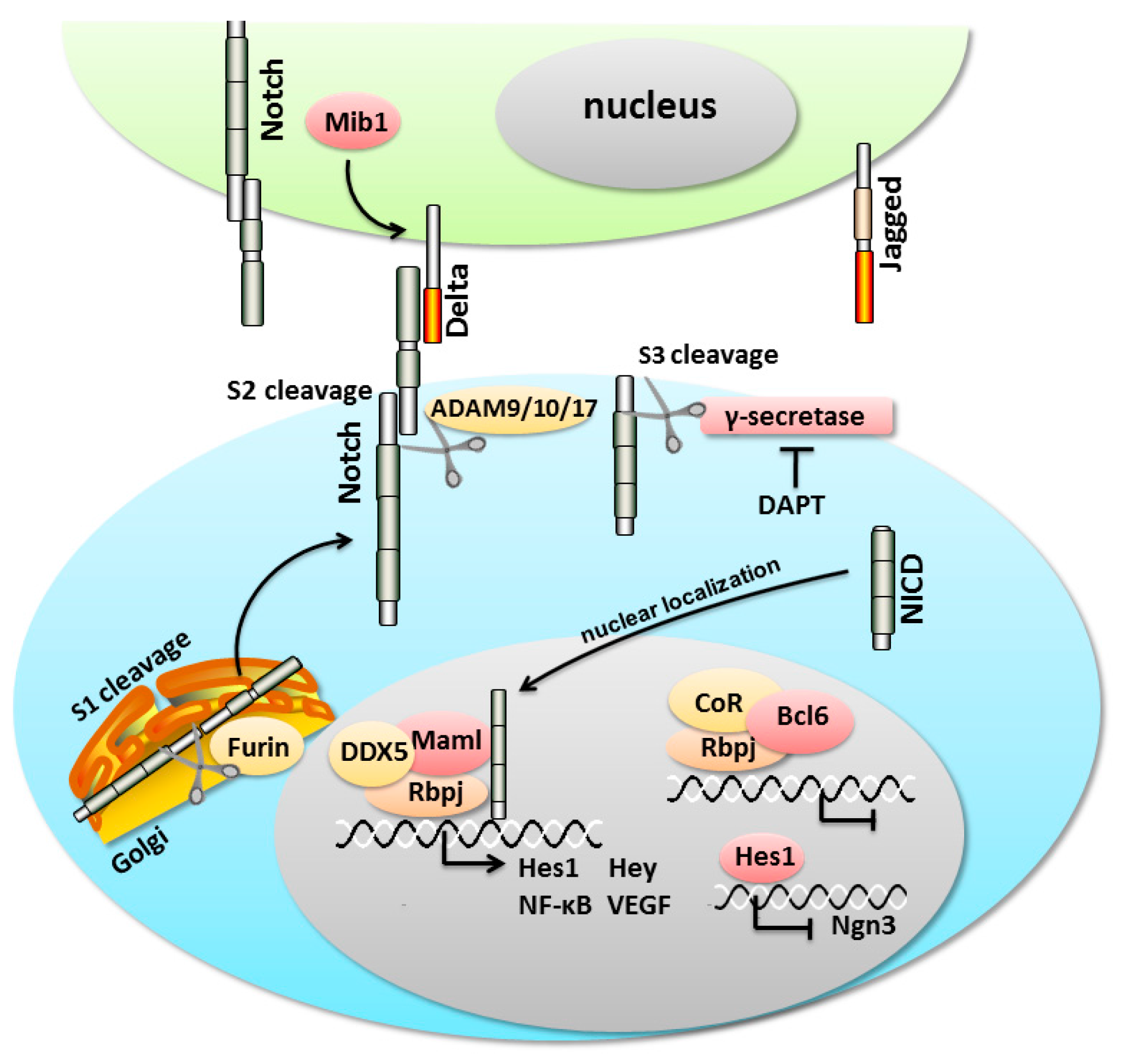Notch genes encode a single-pass transmembrane receptor family of molecules, including Notch1–4 in mammals [65]. Notch proteins contain a large Notch extracellular domain (NECD) composed of 29–36 tandem epidermal growth factor-like repeats, a short Notch transmembrane fragment (NTM), and a Notch intracellular domain (NICD) [66]. As part of the biosynthetic process of Notch, a Furin-like protease in the Golgi cuts nascent Notch proteins at the S1 cleavage site into two fragments [67,68], the NECD and non-NECD domains. Then, they conjugate non-covalently as a heterodimer and target to the cellular surface. The initiation of Notch signaling is trigged by the binding of the NECD domain to type I transmembrane ligands (δ-like 1, 3, 4 (Dll1, 3, 4) and Serrate/Jagged1, 2 (Ser/Jag1, 2)) on adjacent cells. Then, the membrane-bound proteases are activated and continue to cleave the non-NECD domain into two domains, the NTM and NICD domains. This cleavage is catalyzed by A Disintegrin and Metalloprotease (ADAM)-family of metalloproteases at a luminal juxtamembrane site 2 (S2) and by a tetrameric γ-secretase complex at an intramembrane site 3 (S3) of non-NECD domain. After the transcriptionally activated NICD is released and translocates into the nucleus, it binds to Rbp-J [69]. Then, Rbp-J recruits the coactivator Mastermind-like (Maml) to activate downstream genes, including the Hairy enhance of split (Hes) and Hairy/enhancer of spit related with YRPW motif (Hey) families, nuclear factor-κB (NF-κB), vascular growth factor receptor (VEGF), etc. [70,71] (Figure 2). The Hes genes, which encode bHLH transcriptional repressors, play crucial roles in the fate choice and differentiation of stem cells, e.g., in the inner ear, neurons and pancreas development [72,73,74]. Activated Hes1 inhibits the expression of Ngn3 by binding to the proximal promoter and specifically blocking promoter activity [75,76]. However, when Notch signaling is limited or nonexistent, Rbp-J recruits a corepressor (CoR) complex to repress the expression of the Notch target genes (Figure 2).