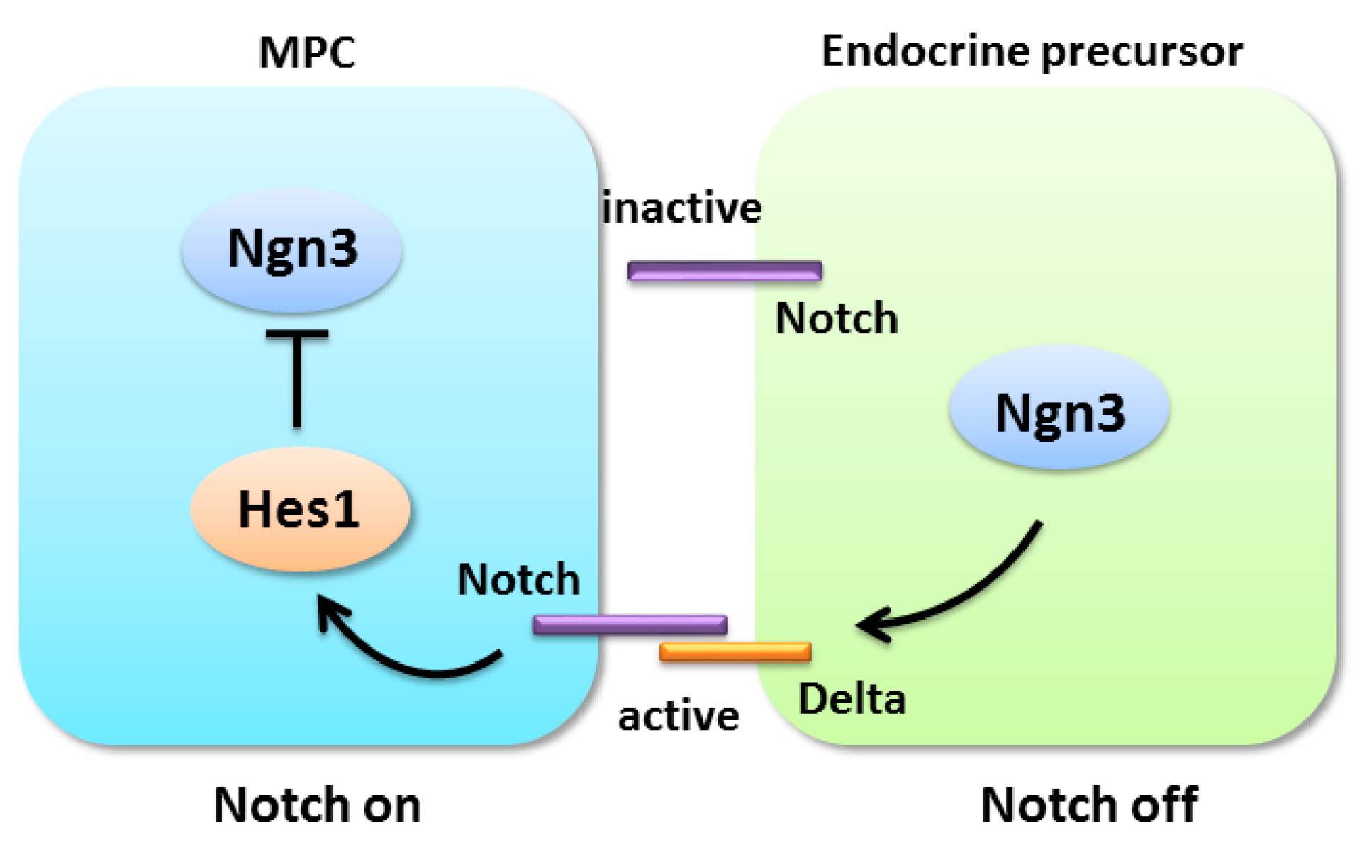 A schematic of Notch signaling during pancreatic development. Notch signaling is initiated by the binding of the ligands and receptors of two neighboring cells. Upon activation, Notch is cleaved, releasing the Notch intracellular domain (NICD). The NICD can subsequently translocate into the nucleus to transcriptionally activate Notch target genes. Hes1 inhibits the expression of Ngn3 by blocking its promoter activity.