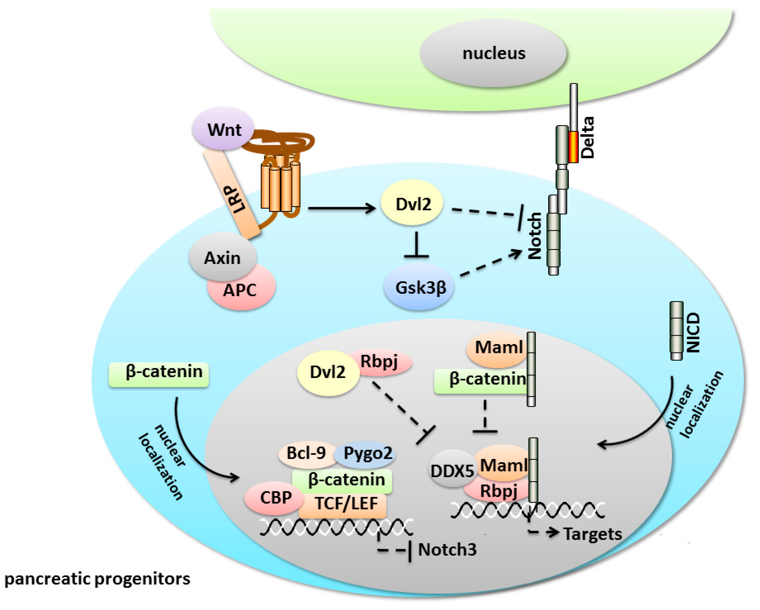 In the early pancreatic lineage commitment, there is a repressive crosstalk between Notch and Wnt signaling. Notch pathway promotes the lineage commitment and differentiation of pancreatic progenitors, whereas Wnt signaling maintains the stem cell state. The opposing activities of Notch and Wnt have also been found in the skin, mammary glands and intestinal stem cells [135,136,137]. Similarly, both pathways can act on the same cell during the development of sensory bristle and epidermal cells in Drosophila and Xenopus [138,139]. In recent years, genetic analysis and proposed mathematical models have explained the dynamics of the crosstalk between the Notch and Wnt pathways. Here, we will summarize the major findings concerning the molecular mechanisms of the interactions between the two signaling pathways. First, Dishevelled 2 (Dvl2) plays a dual role, acting as an activator of Wnt signaling and an inhibitor of Notch activity. Dvl2 blocks Notch signaling directly after interacting with the Notch carboxyl terminus, which results in the disruption of the lateral inhibition signal mediated by Notch in the sensory mother cells (SMCs) of Drosophila [138] (Figure 5). Collu et al. [139], found that Dvl2 binds and inhibits Rbp-J proteins in order to suppress the transcriptional activity of the Rbp-J-NICD-Maml transcriptional activator complex during Xenopus epidermal development (Figure 5). The crosstalk mechanism is conserved between vertebrates and invertebrates, as Dvl2 targets the unique and common pathway component, Rbp-J, a core player in conventional Notch signaling. The similar inhibition of Notch signaling by Dvl2 has been shown during the establishment of planar polarity in the Drosophila eye and leg epithelium [140,141]. The regulation of Notch signaling by the Wnt pathway is shown by the negative effect of Wnt on the Dvl2-mediated GSK3β activity. GSK3β stabilizes the Notch-IC by binding and phosphorylating Notch-IC in the embryonic fibroblasts and N2a cells [142], and GSK-3β inhibition leads to the degradation of Notch-IC mediated by the proteasome (Figure 5). Furthermore, Notch can directly interact with β-catenin. Notch regulates the stability and activity of Armadillo/β-catenin and negatively regulates β-catenin/TCF transcription in Drosophila [143]. In neural precursor cells and vascular progenitors, NICD inhibits β-catenin activity directly by forming a Notch/β-catenin/Rbp-J complex to prevent β-catenin from binding its target sites [144]. The protein complex may play a critical role in cell fate determination in various organs. Lastly, Wnt signaling inhibits Notch activity through Pygopus2 (Pygo2) to promote self-renewal and to prevent the premature differentiation of mammary stem cells (MaSCs) [145]. Pygo2, a histone methylation reader and a context-dependent Wnt/β-catenin coactivator, facilitates the binding of β-catenin to the Notch3 locus and maintains Notch3 in a bivalent chromatin structure in MaSCs [145]. The crosstalk between Wnt and Notch reinforces the balance among stem cells, progenitors and differentiated cells within a tissue, and these confirmed molecular interactions might occur in the pancreas.